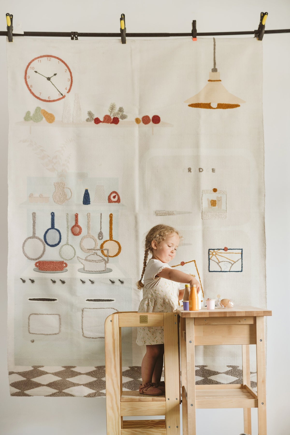 It is a platform that allows the child to participate in activities related to the preparation of meals. Usually children have limited access to a kitchen counter, sink or table. With a kitchen platform the child does not only observe the next stages of preparing dishes, but also takes an active part in preparing dishes, covering the table or dishwashing. The design of the kitchen helper is stable and allows you to adjust the height of the platform and adapt it to the size of child safety, which has a direct impact on the safety of the child and allows them to go up and down without any help. This kitchen helper is a combination of safe assembly technology, stable construction and lightness of form with unconventional yet minimalistic design.